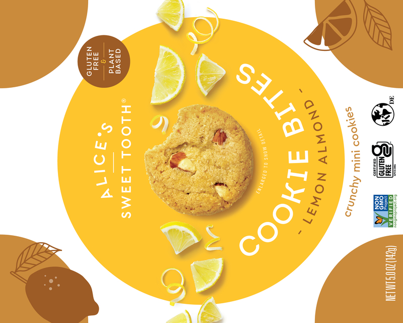 Alice’s Sweet Tooth Lemon Almond Cookie Bites Mini- Cookies are Gluten-Free, Vegan, Plant-Based, crunchy, light small cookies perfect for an anytime snack. Certifications: Gluten-free, Non-GMO, Kosher. Grain-free, Dairy-Free.