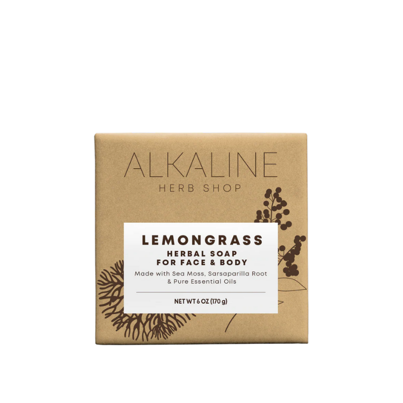 Alkaline Herb Shop’s Sea Moss, Sarsaparilla & Lemongrass Soap is a plant-based body bar crafted with olive oil, coconut oil, wild-crafted sea moss gel, sarsaparilla root powder, and aromatic lemongrass oil. The formula is chemical-free, “true soap” (saponified oils) and provides a gentle cleanse while helping skin feel soft and refreshed.