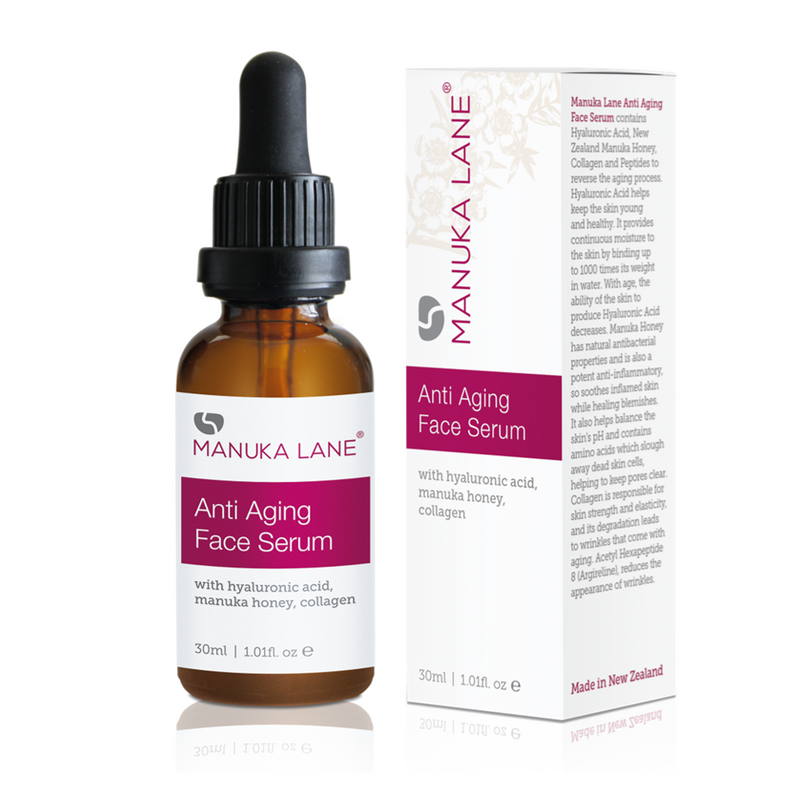 Contains Hyaluronic Acid, New Zealand Manuka Honey, Collagen, and Peptides to reverse the aging process. Hyaluronic Acid helps keep the skin young and healthy. It provides continuous moisture to the skin by binding up to 1000 times its weight in water. With age, the ability of the skin to produce Hyaluronic Acid decreases. Manuka Honey has natural antibacterial properties and is also a potent anti-inflammatory, so soothes inflamed skin while healing blemishes. It also helps balance the skin’s pH and contains amino acids which slough away dead skin cells, helping to keep pores clear. Collagen is responsible for skin strength and elasticity, and its degradation leads to wrinkles that come with aging. Acetyl Hexapeptide 8 (Argireline), reduces the appearance of wrinkles. 30ml | 1.01fl.oz