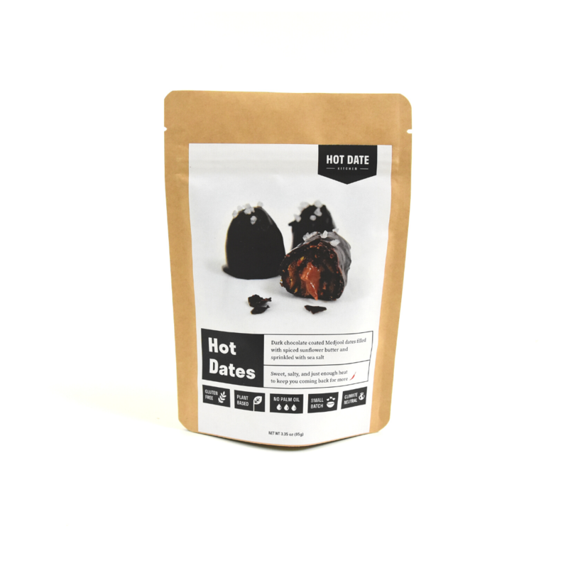 Dark chocolate coated Medjool dates filled with spiced sunflower butter and a touch of sea salt.