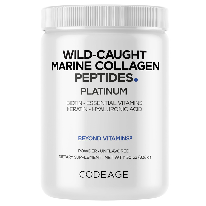 Codeage Wild Caught Marine Collagen Peptides Powder Platinum is a high-quality collagen supplement made from wild-caught marine collagen from North American cold waters. It contains a high level of hydrolyzed fish collagen powder types 1 and 3, 10,000 mcg biotin, vitamin C, vitamin D3, vitamin B6, niacin, pantothenic acid, and hydrolyzed keratin.