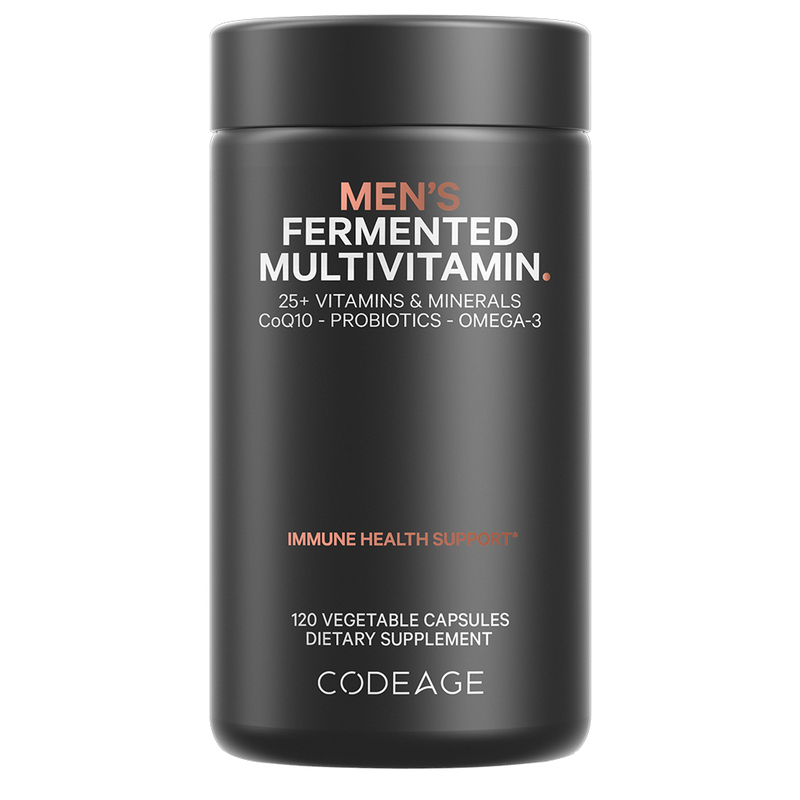 All-in-one daily multivitamin for men supplement with essential vitamins A, B6, B12, C, D3, E, K2, minerals like calcium, magnesium, and key nutrients like biotin, folate, iodine, iron, omega-3, lutein, and phosphorus, plus zinc, selenium, copper, niacin, and activated minerals. Formulated with whole foods, fermented herbs, probiotics, digestive enzyme blend, and CoQ10.