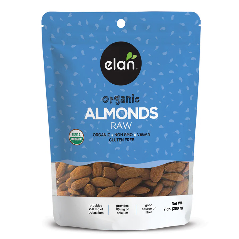 Elan Organic Raw Almonds are whole, untreated nuts with no added oils, salt, or sugar, just clean, natural crunch.