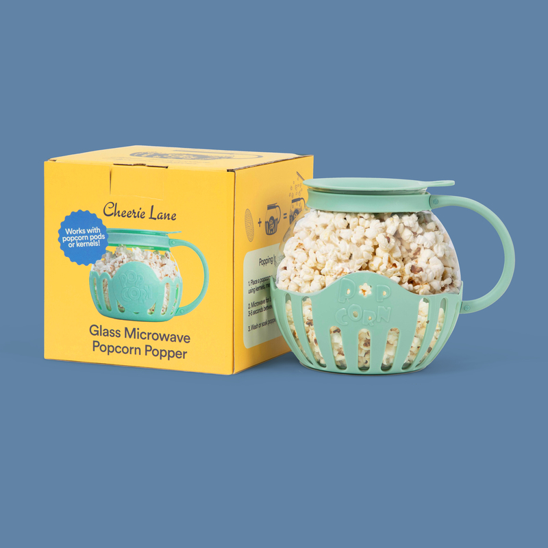 An easy way to enjoy the perfect bowl of popcorn. Our popper works great with any kernels and is especially great with our Cheerie Lane Popcorn Pods. The glass microwave popper is made with temperature-safe glass for the microwave, and is dishwasher safe too. It's eco-friendly and doesn't leave an aftertaste like many silicone poppers do. Makes up to 9.5 cups of popcorn. Branded with Cheerie Lane's logo on the lid and comes in a cute box that's perfect for gifting and looks great on retail shelves.