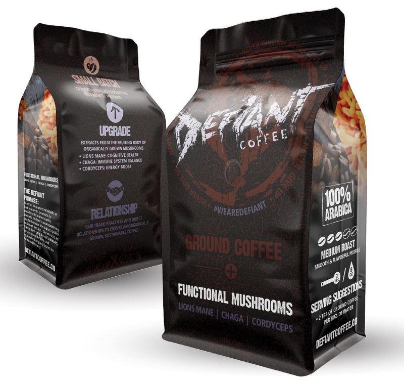 Organic fair trade coffee, organic lion's mane extract, organic chaga extract, organic cordyceps extracts.