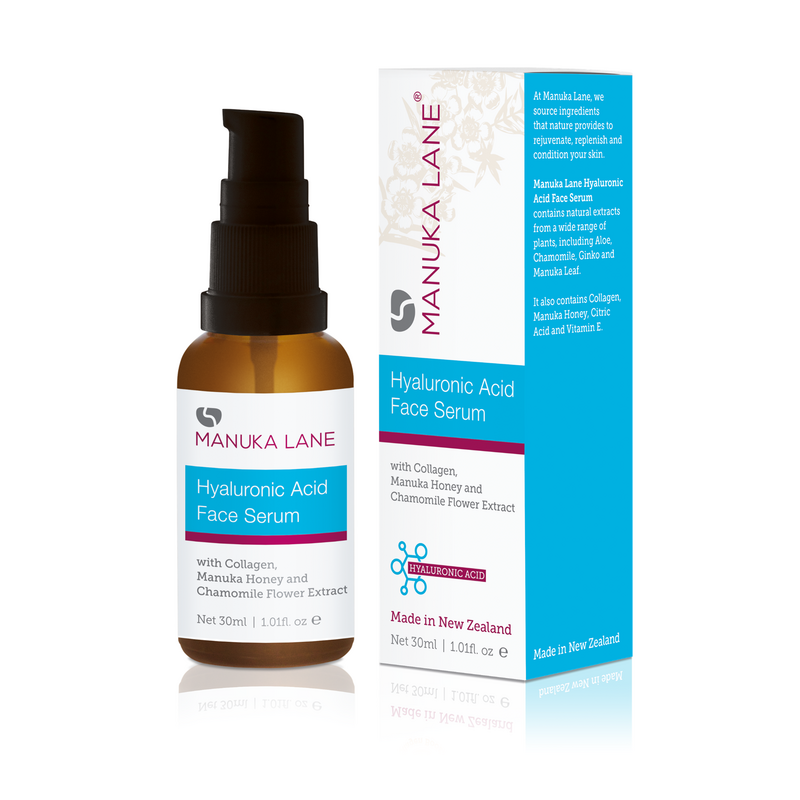 Manuka Lane Hyaluronic Acid Face Serum contains Collagen, Manuka Honey, and natural plant extracts.