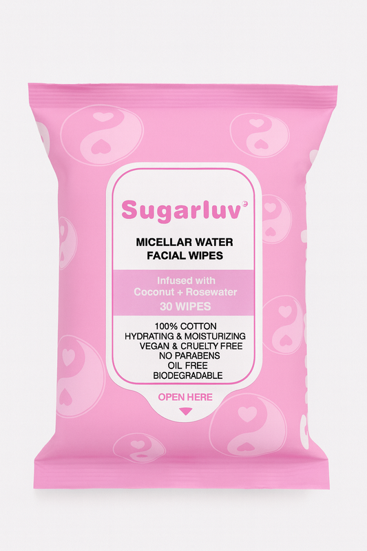 Luv your face by gently wiping away makeup, dirt, oil and sweat from your face and neck. Our cleansing wipes are infused with Micellar Water, and natural coconut and rosewater extracts which help moisturize, hydrate and cleanse. Made with 100% Biodegradable Cotton, and free of harsh chemicals, our products are vegan and cruelty-free.