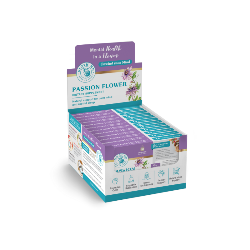 The Sloth MD Passion Flower Travel Pack introduces a new profit opportunity in the natural stress and relaxation category. Each vegetarian capsule contains 500mg of pure, high-potency Passion Flower extract (10:1) — a clean, non-sedative formula with no fillers or artificial ingredients.