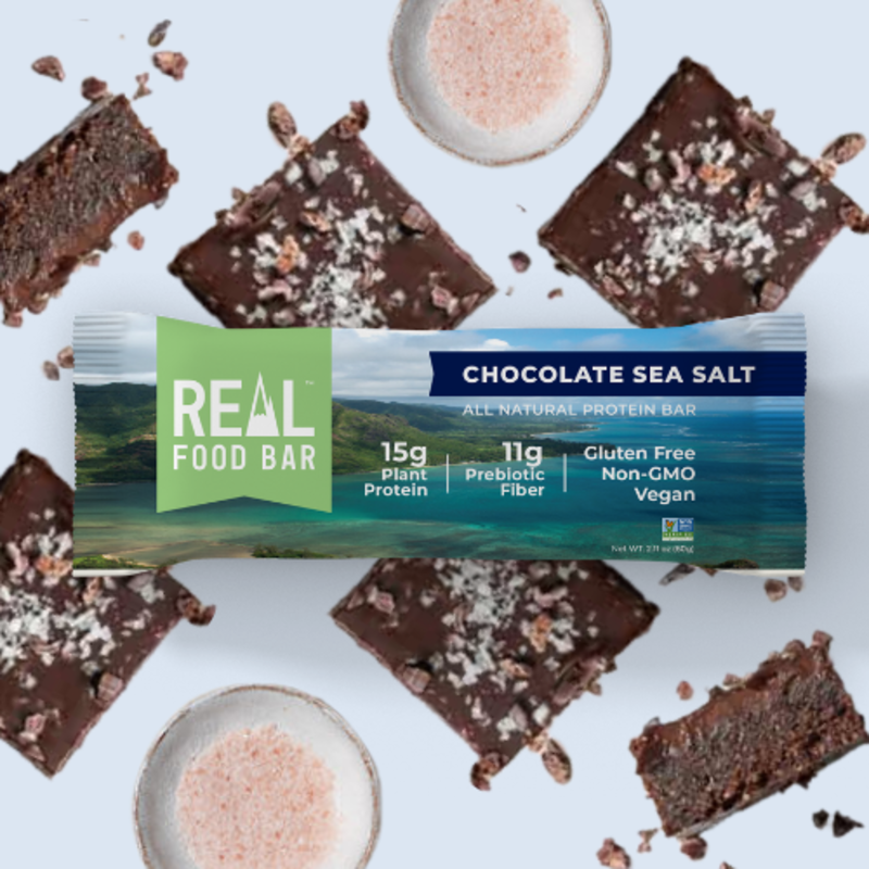 Real Food Bar's Chocolate Sea Salt is like a salty decadent brownie without the guilt. 15g plant protein, 11g prebiotic fiber, Only 7g natural sugar. 210 calories, 11g net carbs. Vegan, gluten free, dairy free, soy free, Non-GMO.