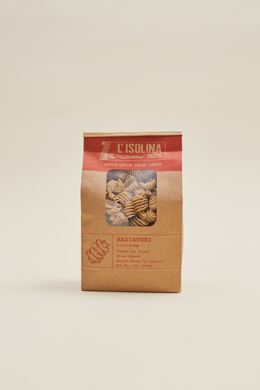 L'Isolina Pasta is made with local whole grains farmed for flavor, stone-milled, and bronze extruded all in New York State!