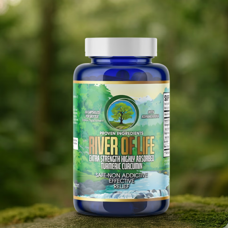 River of Life Capsules pair high-bioavailability turmeric-curcumin (with BioPerine black pepper) and ashwagandha root, plus ginger and bromelain. Designed to help reduce joint discomfort, support mobility, manage inflammation and promote mental calm—all with a plant-based formula.