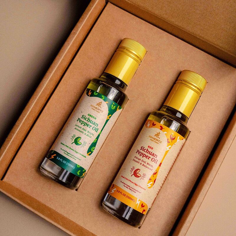 Our elegantly designed holiday gift pack contains one Green and one Red Sichuan Pepper Oil, accompanied by our informational insert card which tells the stories of our brand and the less known facts about Sichuan Pepper.