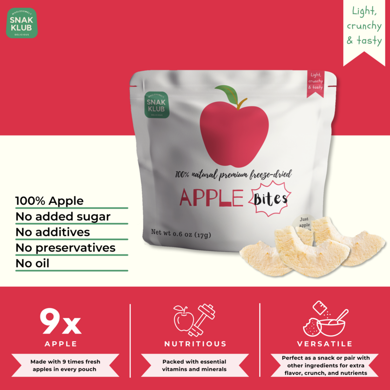 • Each single-serve Apple Bites pouch is 0.6 oz (17g) — it takes ~9x of fresh apples (~5.3 oz or 150g) to make one pouch of Apple Bites